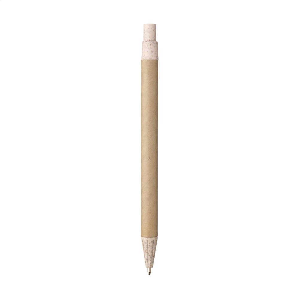 Deze blauwschrijvende balpen is een alternatief voor de reguliere plastic pen. De body van deze pen is gemaakt van opgerold gerecycled papier én het restafval product bij de tarwe productie. Er wordt heel veel tarwe geproduceerd voor onze voedingsindustrie en dat betekent dan ook veel afval in de vorm van blad en riet. Door de productie van deze pen krijgt dit afval een tweede leven.
