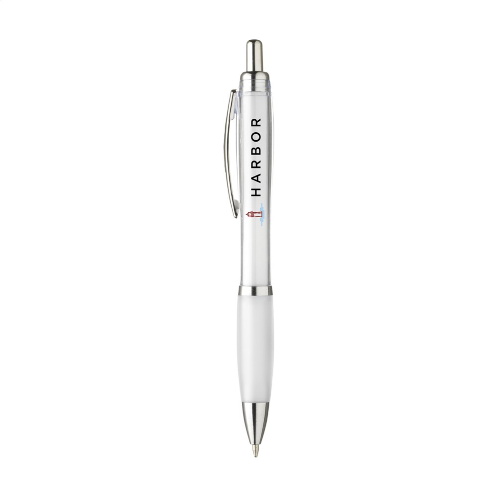 Blauwschrijvende óf zwartschrijvende balpen met transparantgekleurde houder, gripvast voorstuk en metalen clip.