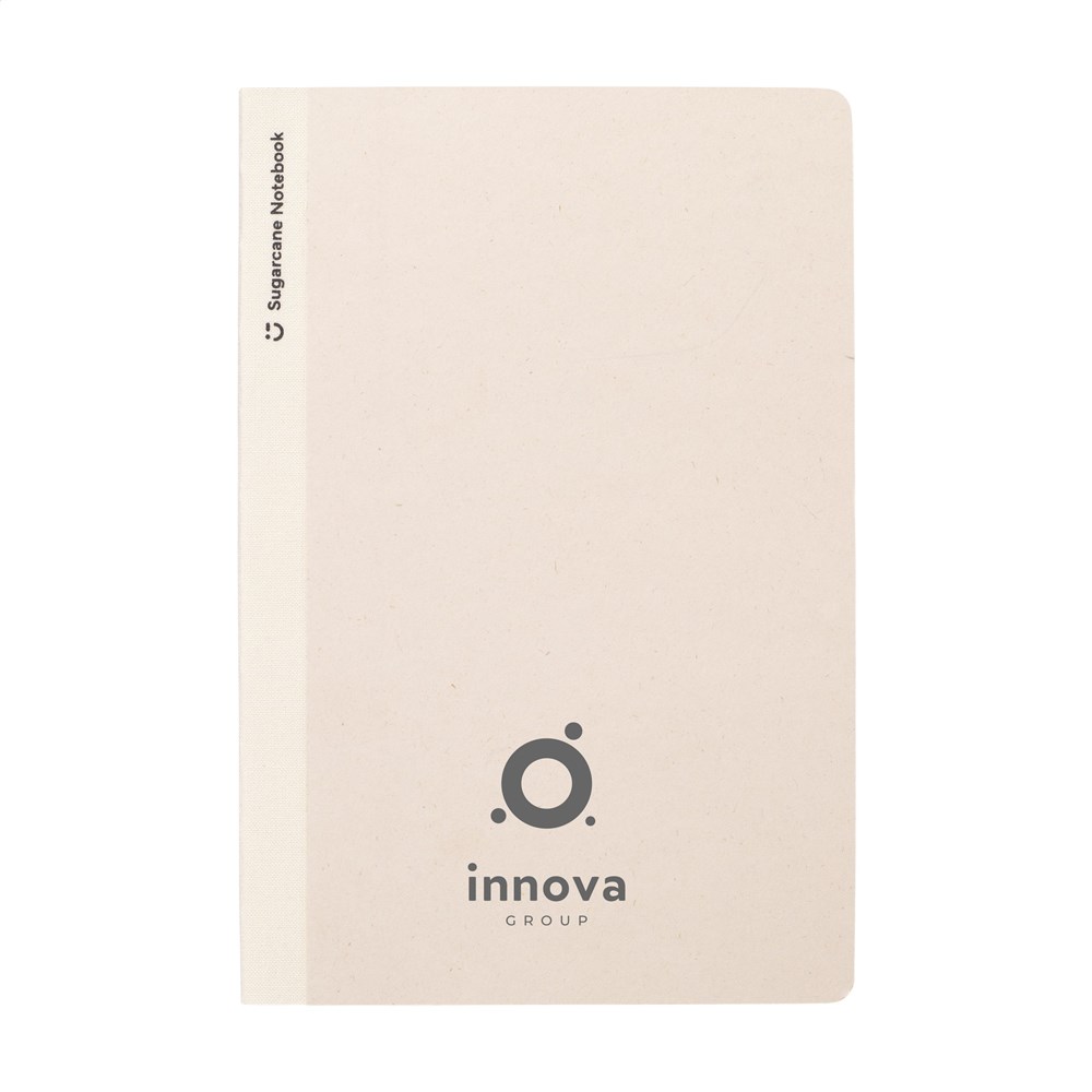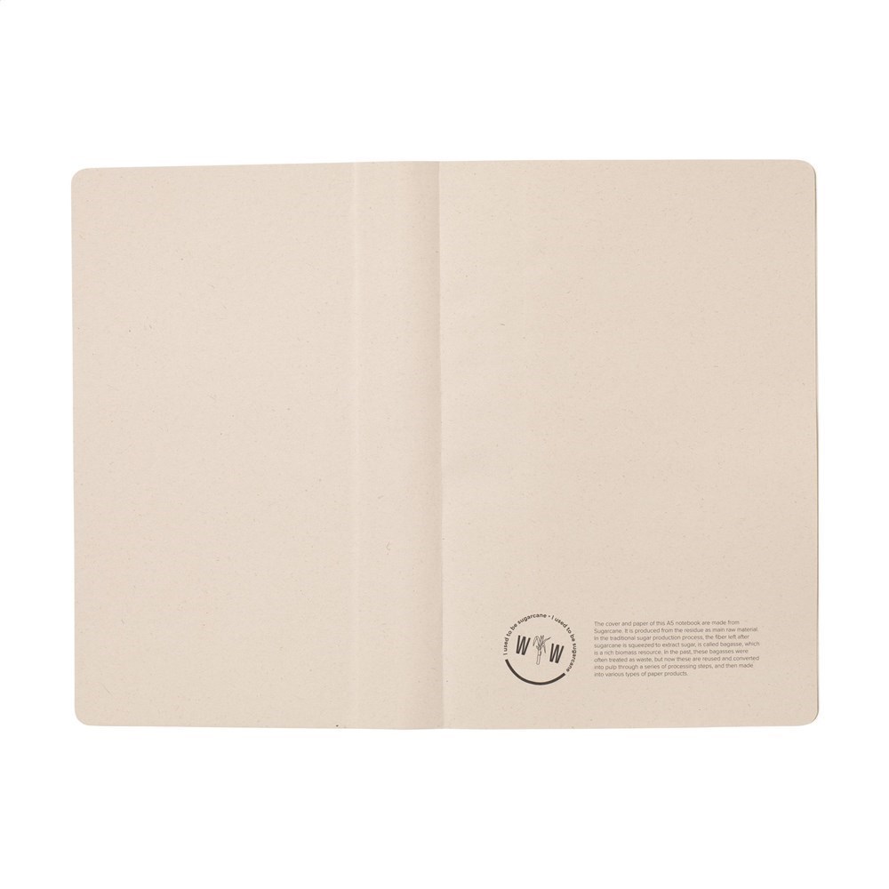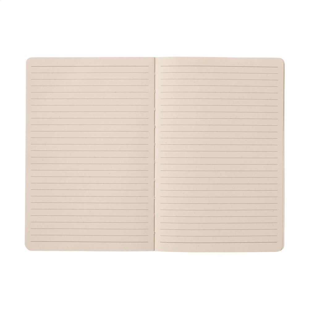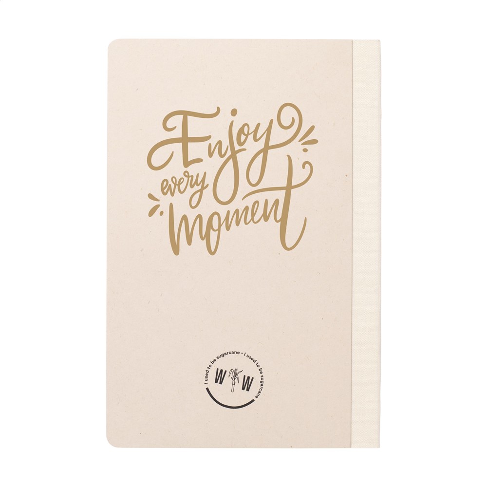 Exclusief notitieboek in A5-formaat, gemaakt van het gerecycled afval van de suikerrietplant. Met hardcover en 80 vel/160 pagina's gelinieerd papier (100 g/m²). De hardcover en het papier zijn FSC Mix gecertificeerd. Het papier, waarin kleine vezels zichtbaar zijn, heeft een mooie lichtbruine kleur. Dit benadrukt het gebruik van natuurlijke materialen. Na de oogst van de suikerrietplant blijven de wortels van de plant in de grond en worden de stengels en bladeren verwerkt tot een residu dat gebruikt wordt voor het maken van papier. Een suikerrietplant haalt tijdens de groei CO2 uit de lucht en kan wel tot 10 jaar oud worden