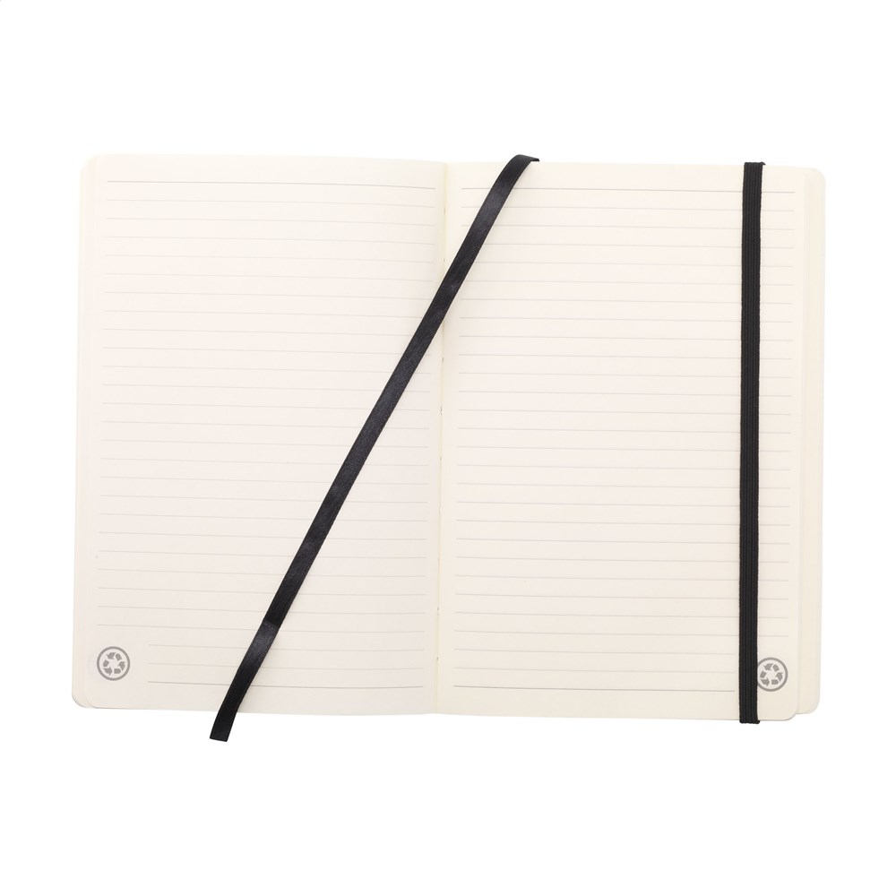 A5-notitieboek met een FSC gecertificeerde cover gemaakt van gerecycled leerafval. Gebruikt leer wordt verwerkt tot nieuw bruikbaar leer dat voor verschillende doeleinden wordt gebruikt, zoals de prachtige kaft van dit notitieboekje. Het boekje heeft ca. 96 vel/192 pagina's crèmekleurig, gelinieerd, FSC Mix gecertificeerd papier (80 g/m²). Met gebonden rug en handige sluitelastiek. Per stuk in kraft doos.