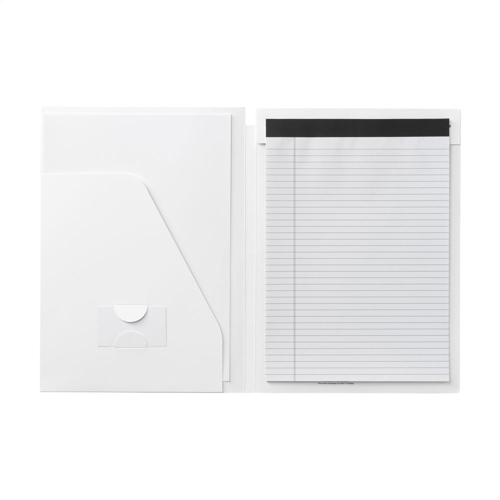 Schrijfmap/documentenmap van stevig FSC 100% gecertificeerd kraftkarton (350 g/m²). Inclusief schrijfblok met ca. 30 vel gelinieerd, FSC 100% gecertificeerd papier (70 g/m²). Met handig insteekvak aan de binnenzijde voorzien van ruimte voor het insteken van een visitekaartje. Geschikt voor A4-documenten. Deze map beschermt documenten en is geschikt voor zakelijke, studie- of privédoeleinden.