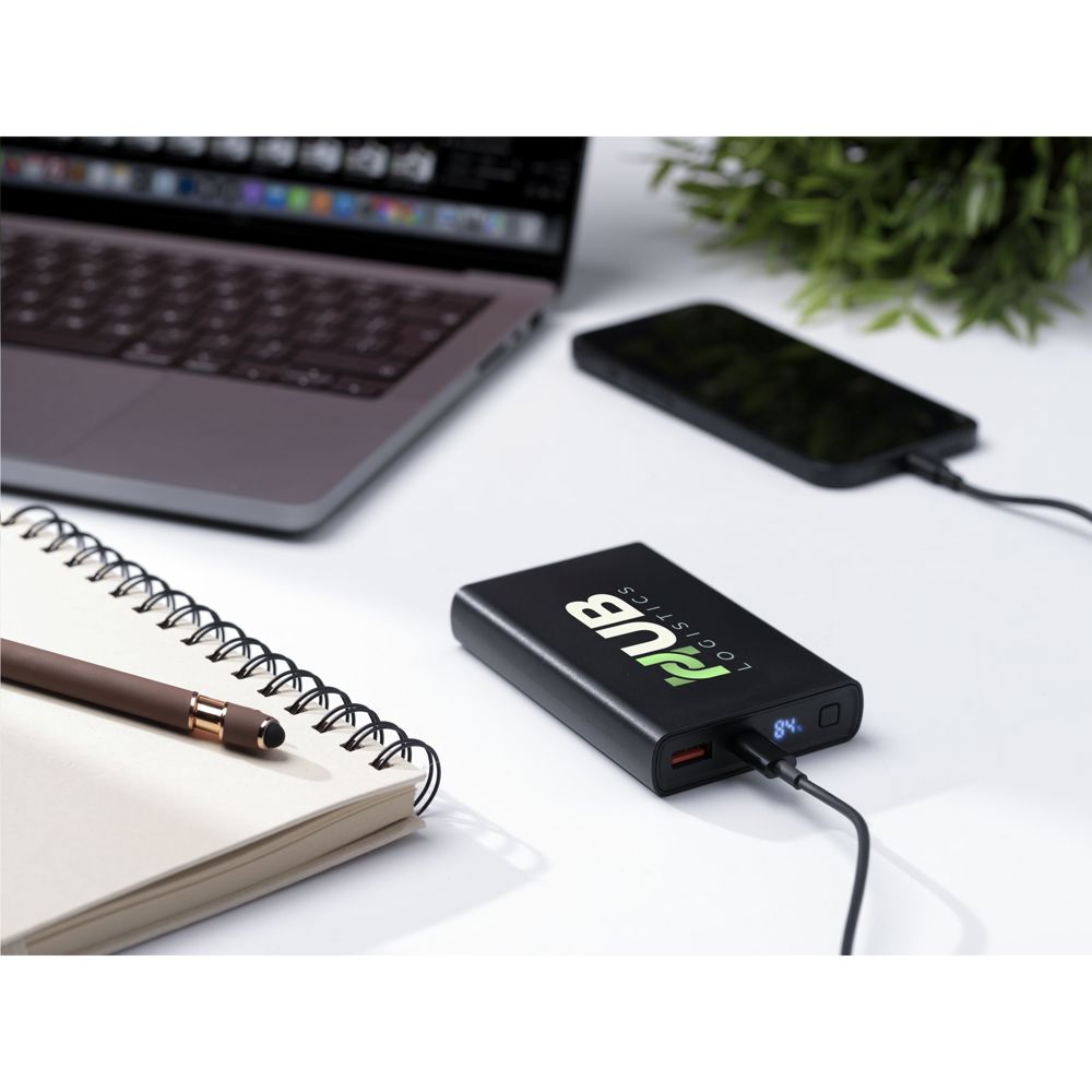 Krachtige powerbank met ingebouwde 10.000 mAh lithium-polymeerbatterij. De behuizing is gemaakt van 100% RCS-gecertificeerd gereycled ABS. Met aan/uitknop en een display met batterij-indicatie in procenten. Type-C input: DC5V/3A, 9V/2A, 12/1.5A. Type-C output: DC5V/3A, 9V/2.22A, 12/1.67A. USB-A-output: DC5V/3A, 9V/2A, 12/1.5A. Wired output: 22W. Inclusief rTPE oplaadkabel USB-C naar USB-C en gebruiksaanwijzing. Per stuk verpakt.