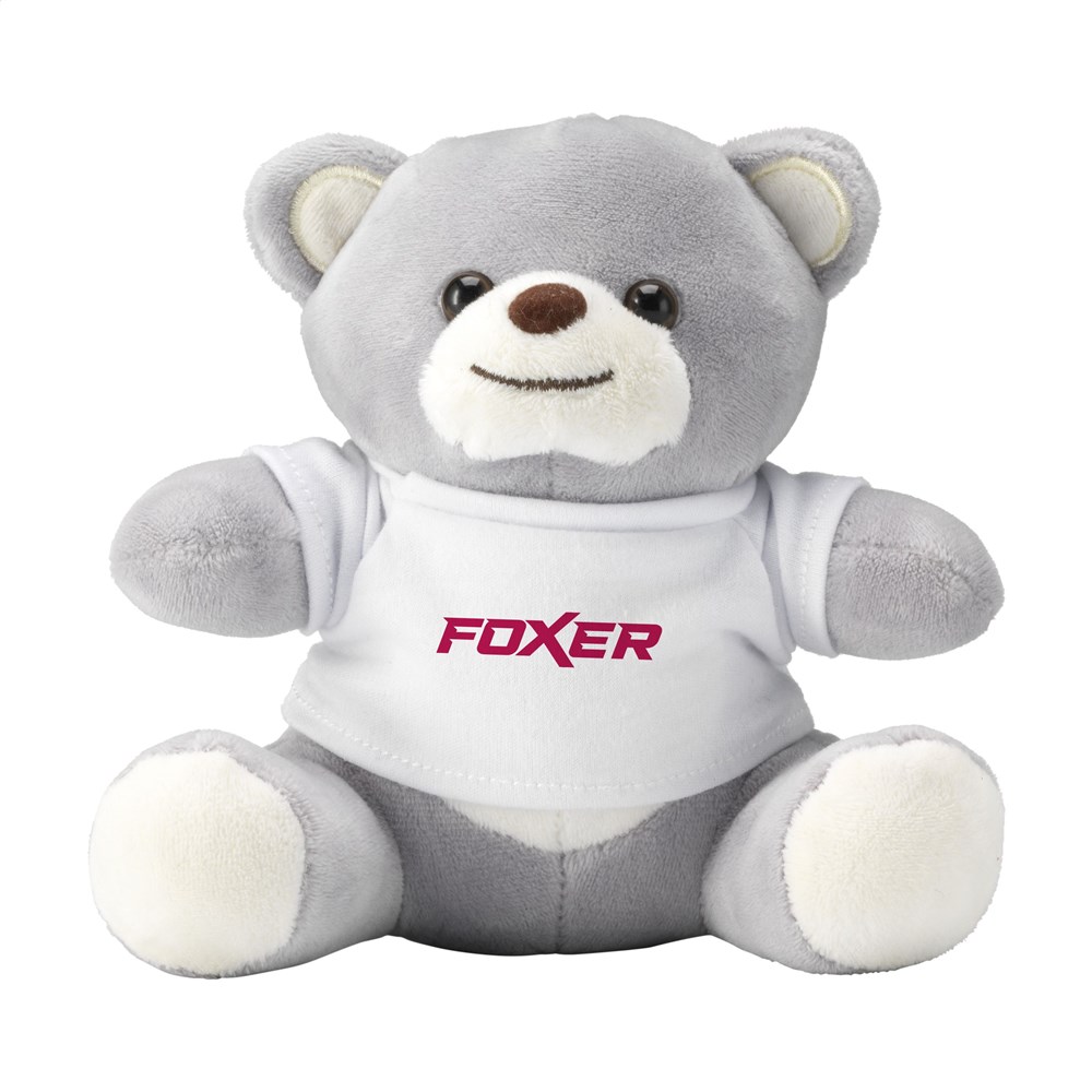 Lichtgrijze, superzachte knuffelbeer in mini formaat. Met kraalogen, verharde neus en wit T-shirt. Zonder opdruk worden de beren en T-shirts los geleverd.
